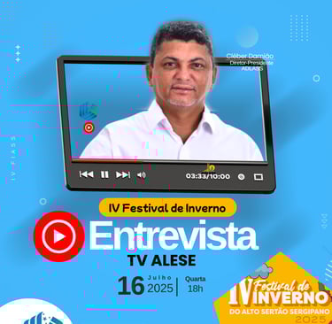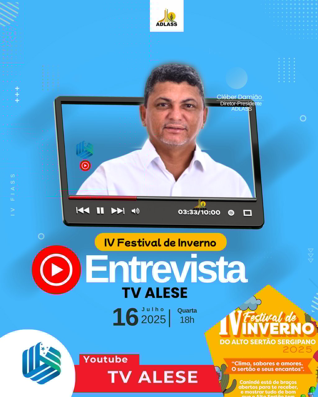 Aracaju, 16/07/2025 – O Diretor-Presidente da ADLASS (Agência de Desenvolvimento LIDER do Alto Sertão Sergipano), Cléber Damião, e o secretário executivo João Chagas concederão, participam hoje, 16, de uma entrevista exclusiva para a TV ALESE. A entrevista, que será transmitida ao vivo a partir das 18h, tem como objetivo divulgar a 4ª edição do Festival de Inverno do Alto Sertão Sergipano (FIASS 2024).